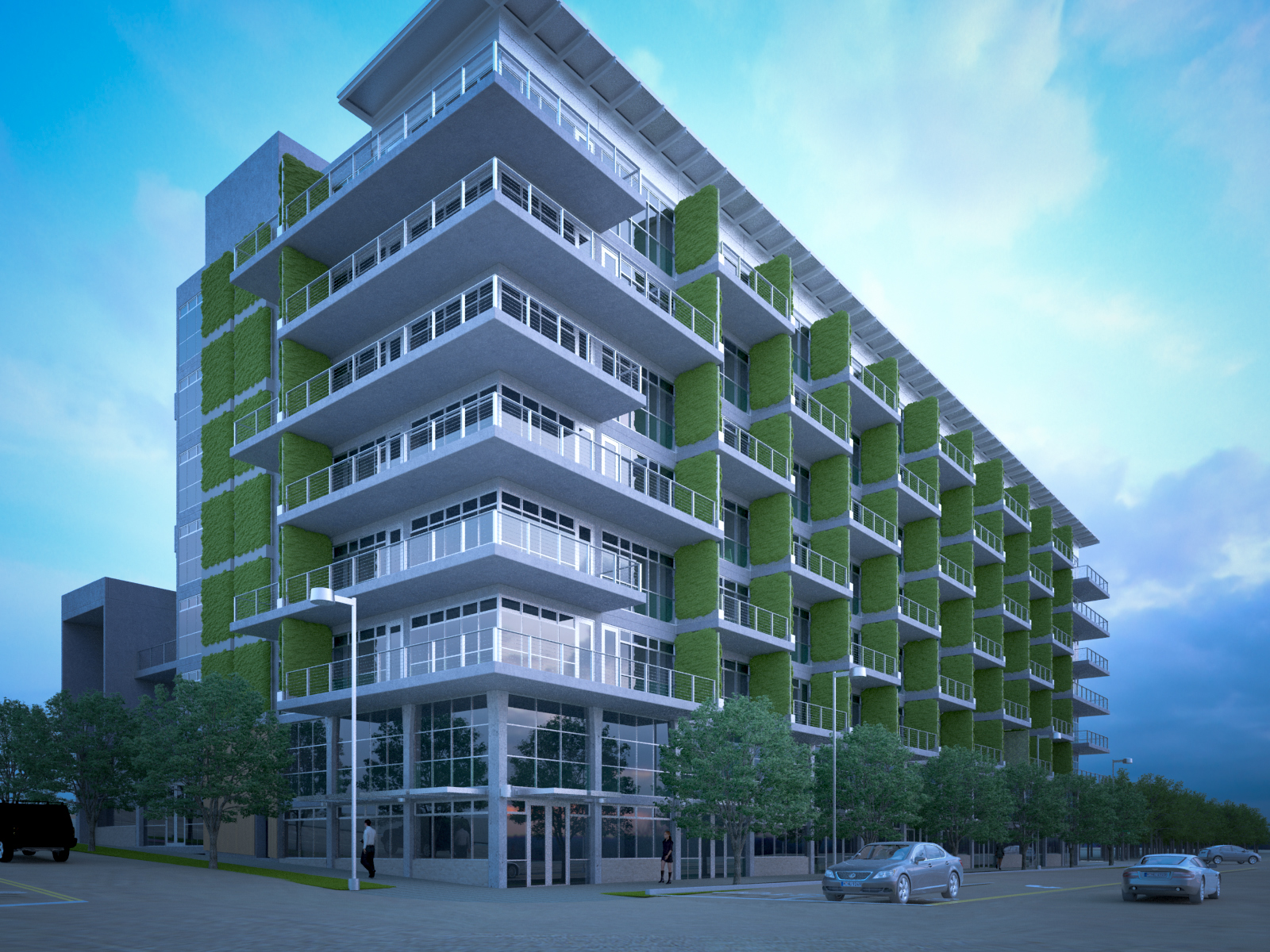 An 8 story retail / residential mixed-use project is proposed in the heart of East Village in downtown San Diego. The lower two stories are designed for retail uses while 120 residential units take up the upper six levels. The parking is provided with three subterranean levels. The building features a high capacity solar PV array which offsets grid energy consumption, and the roof cistern provides irrigation water for the planted green facade.